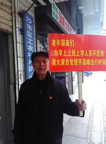 プラカードを掲げていた老人は、汪長栄さんといい、沙市區(qū)章華臺(tái)団地に住んでいる。8日、沙市第六中學(xué)の向かい側(cè)にあるバス停は、午前9時(shí)前から、すでに朝の通勤ラッシュが始まっていた。汪さんは、赤いプラカードを掲げ、バス停に立っていた。プラカードには、「高齢者のみなさん、出勤?通學(xué)の人たちは遅刻厳禁です。時(shí)差外出を心がけましょう」という呼びかけが三行で書かれていた。