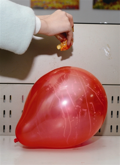 実験の結(jié)果、みかんや柚子、オレンジの皮の汁を風(fēng)船にかけると、風(fēng)船はたちまち破裂した。ところが、果肉から絞った果汁をかけた場(chǎng)合、風(fēng)船は破裂しなかった。