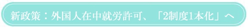 今年の10月1日から、多くの國(guó)內(nèi)試行都市で外國(guó)人在中就労許可制度が試験的に実施がスタートした。同制度は、もとの「外國(guó)人入國(guó)就労許可」と「外國(guó)人専門(mén)家在中就労許可」を一本化した新制度で、中國(guó)で就労する外國(guó)人をA、B、Cの三種類(lèi)に分類(lèi)して管理を行う。來(lái)年4月から、「2制度1本化」の実施範(fàn)囲は全國(guó)に拡大される。>>詳細(xì)へ