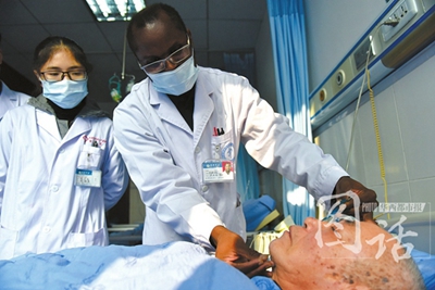 11月14日朝、暖かな冬の日差しが、成都市新都區(qū)にある中醫(yī)病院の病室に差し込み、駱さんの身體のツボに打たれた3本の毫針の影を映し出していた。鍼の一端をつまんだ黒い手が、熟練した技術(shù)でその鍼を回転させながら肌に打ちこんでいる。「駱さん、少し具合良くなりましたか?」―ディアラ醫(yī)師は、四川方言で患者に尋ねながら、患者の脈を取り、顔つきや舌を観察し、「看る?嗅ぐ?聞く?觸る」ことで極めて丁寧に診察を進(jìn)めた。その巧みで完璧な診察によって、ディアラ醫(yī)師は患者たちから高い評(píng)判を集めている。