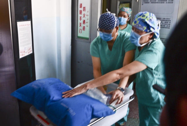 12月22日、ウルムチ市児童病院內(nèi)。患者を手術(shù)室から運び出す醫(yī)療スタッフ。(撮影:新華社記者 王菲)