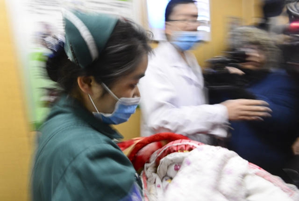 12月22日、ウルムチ市児童病院內(nèi)。精密検査のため患者を抱いて新生児科に急いで向かう救急センターの醫(yī)療スタッフ。(撮影:新華社記者 王菲)