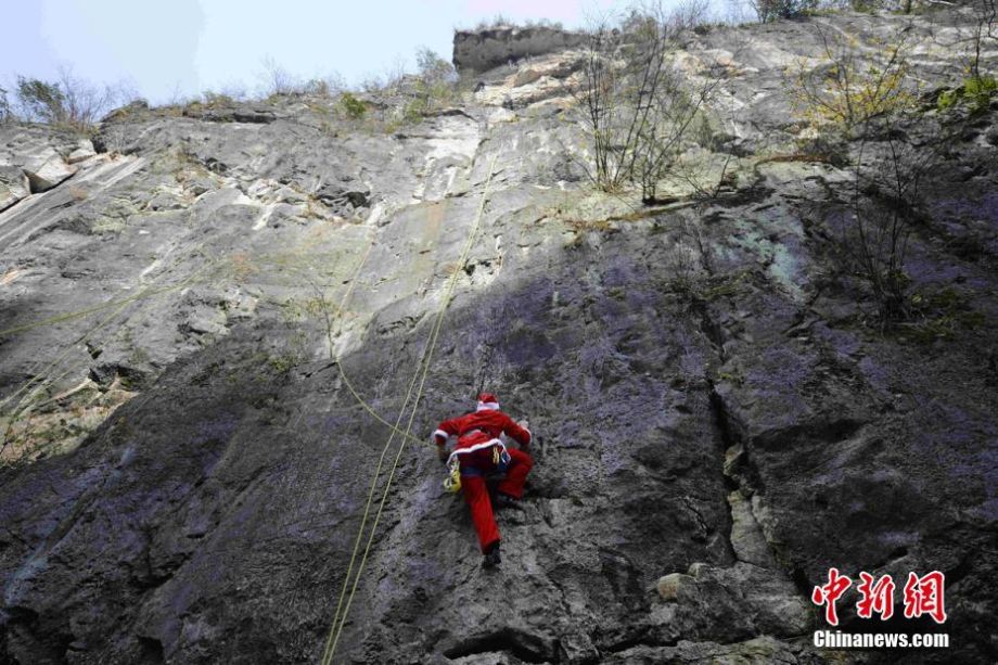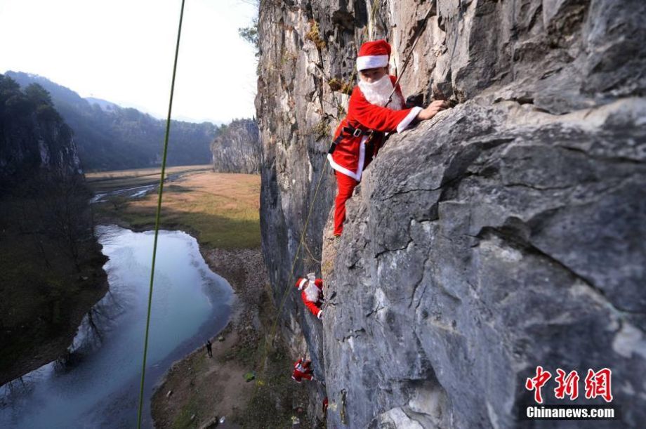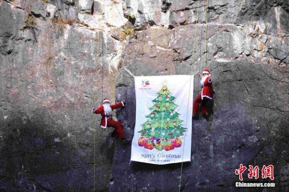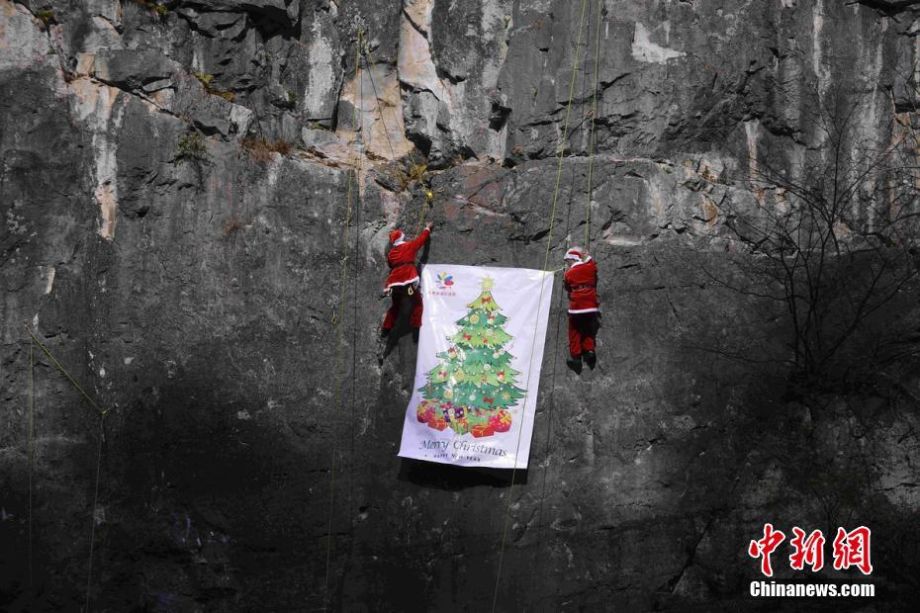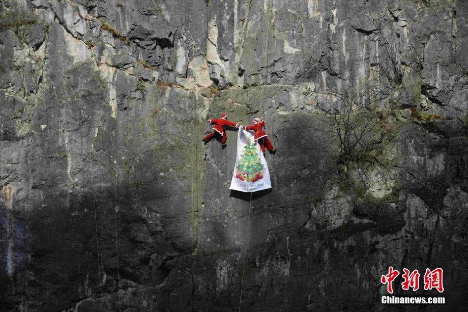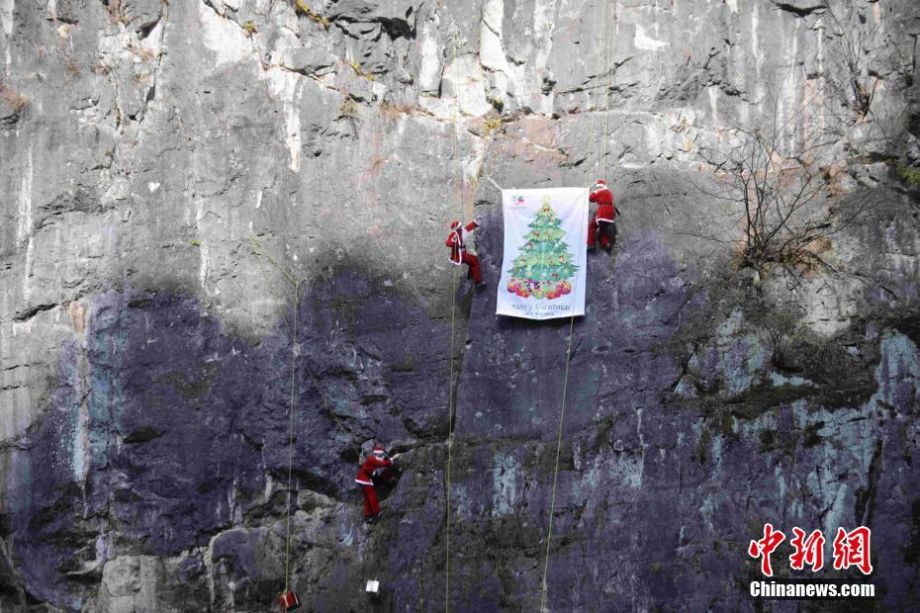 クリスマスを間近に控えた22日、湖南省の■江景勝地(■はさんずいに眉)の三道巖門(mén)では景勝地の管理スタッフたちがサンタクロースのコスプレで高く切り立った崖を100メートルほどの高さまで登った。スタッフたちは崖にプレゼントの箱を置き、クリスマスツリーの絵が描かれた大きなポスターを掛け、クリスマスを迎える準(zhǔn)備を行った。中國(guó)新聞網(wǎng)が伝えた。(編集YK)
