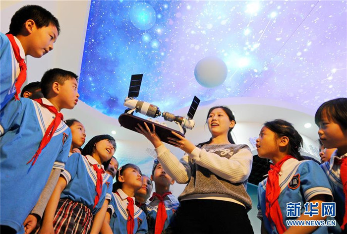 河北省■臺経済開発區(qū)(■は刑のへんにおおざと)の思源実験學校の、「宇宙の夢、中國の夢」をテーマとする科學知識普及イベントにおいて、教員が生徒に宇宙関連知識について解説する様子