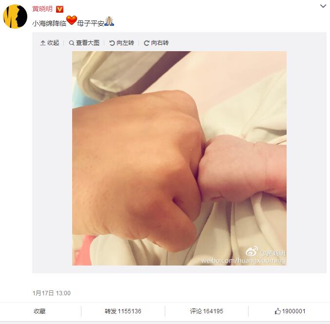 黃暁明(ホアン?シャオミン)とアンジェラベイビーの所屬事務(wù)所が17日午前、「アンジェラベイビーは今朝、香港で第一子を無事出産した」という喜びの知らせを明らかにした。第一子の誕生を迎えた二人はとうとうパパとママとしてのデビューを飾った。黃暁明はその後、微博(ウェイボー)で親子の最初の記念寫真を投稿。黃暁明の大きな握りこぶしと新生児の小さな握りこぶしが觸れ合う寫真で、どうやら「二人の男」の間で初めての「會話」が交わされたようだ。そしてこの嬉しい知らせを知った蕓能界の友人である趙薇(ヴィッキー?チャオ)や姚晨(ヤオ?チェン)、楊冪(ヤン? ミー)、李冰冰(リー?ビンビン)などは次々と祝福メッセージを送った。人民網(wǎng)が伝えた。(編集YF)