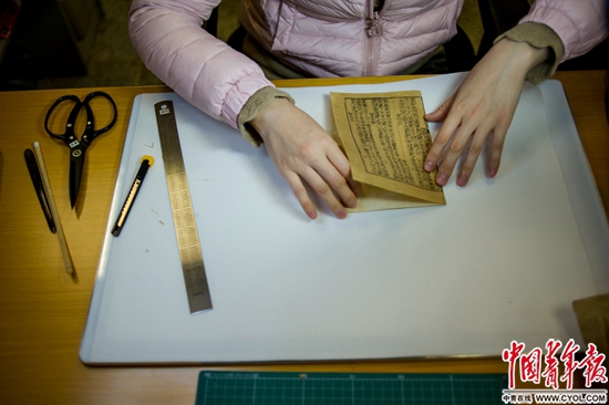 中國(guó)國(guó)家図書館の修復(fù)室で、古書の1ページの修復(fù)作業(yè)をする潘菲さん(2016年12月20日、撮影?李雋輝)。