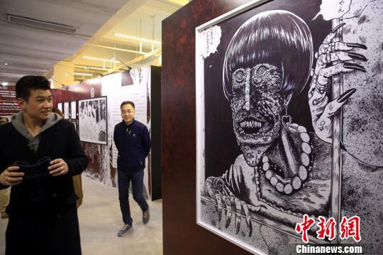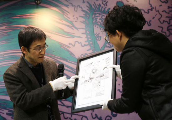 上海の企畫展のために制作した手描き原稿を紹介する漫畫家?伊藤潤二氏。