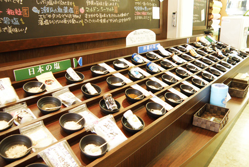 「牡蠣の塩」のほかにも、さまざまな珍しい塩が並んでいる。例えば、「減塩醤油」を煮詰めて作られた「醤油の塩」、炭火で作る製造プロセスで、塩を燻してできた「竹炭の塩」、満月の夜に汲み取った、満月のパワーあふれる「満月の塩」。このほか、沖縄伊江島で天日干しして作った「荒波の塩」、香川県で300年間続く伝統(tǒng)的な「入浜式の塩」、日本最西端にある與那國(guó)島の手作り塩「黒潮源流塩」、沖縄久米島の海洋深層水を100%使って取り出した、口當(dāng)たりがまろやかで小さな子供にぴったりの「球美の塩」などがある。さらには、沖縄県宮古島の「雪塩」、海藻精華と海塩を混ぜ合わせてできた甘い口當(dāng)たりの「瀬戸の粗藻塩」、美容効果がある塩、塩アイスクリームなど、ありとあらゆる珍しい塩製品が揃っている。