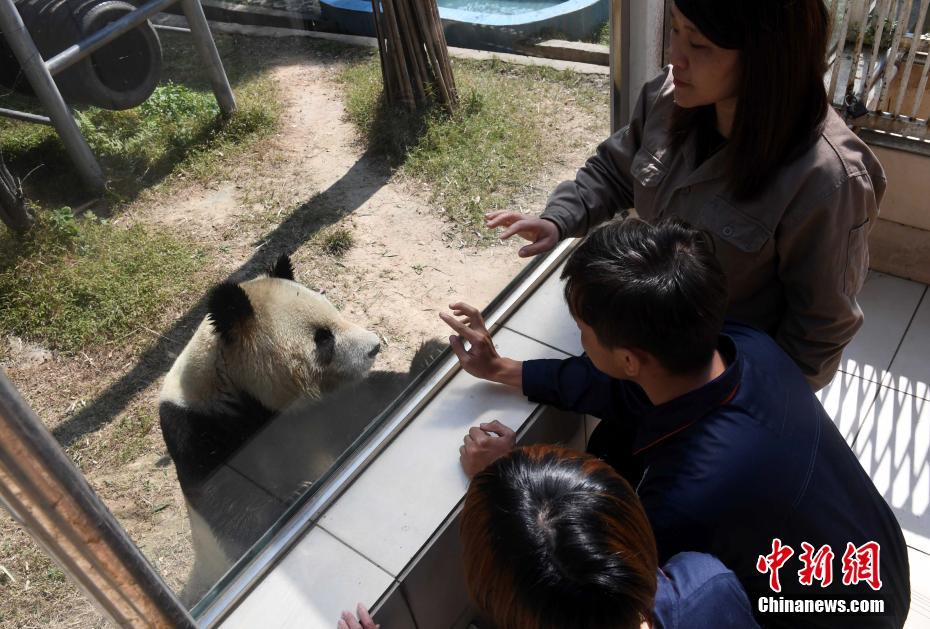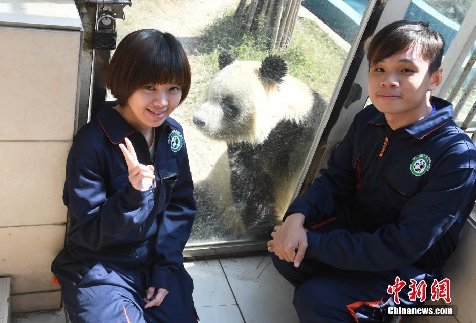 臺(tái)灣大學(xué)と臺(tái)灣嘉義大學(xué)からやって來た臺(tái)灣地區(qū)の大學(xué)生8人が16日、教師2人に引率されて、福建省の海峽(福州)パンダワールドを訪れ、飼育員の仕事を體験した。寫真は、4番のジャイアントパンダと記念撮影を撮る、臺(tái)灣大學(xué)2年の鄭志明さん(寫真右)と臺(tái)灣嘉義大學(xué)4年の王兪琇さん(寫真左、撮影?劉可耕)。中國新聞網(wǎng)が伝えた。(編集YK)