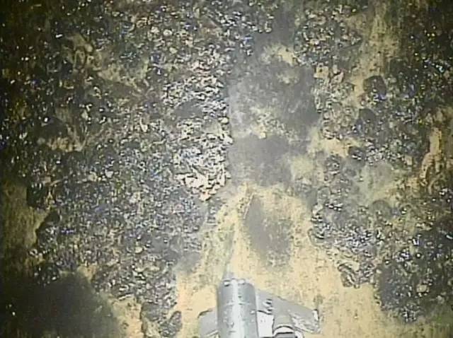 高圧の水を噴射しながら內(nèi)部調(diào)査をするロボット。堆積物の様子をカメラで捉えている。
