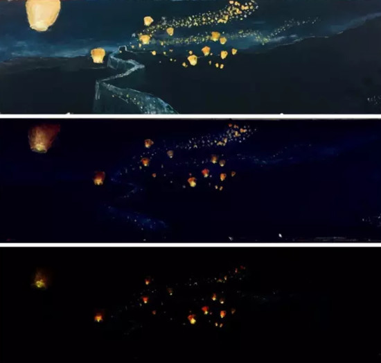 連綿と続く萬(wàn)里の長(zhǎng)城や夜空いっぱいに輝く孔明燈など、彼女の手にかかれば、張蕓謀(チャン?イーモウ)監(jiān)督の映畫「長(zhǎng)城(UNTITLED GREAT WALL PROJECT)」のワンシーンがたちまち黒板アートに。またある時(shí)は水彩畫に蛍光塗料を混ぜることを思いつき、明るさの具合で夜間でも全く違った顔を見せる黒板アートを作成した。この作品は完成後、異なる明るさの下で撮影された3枚の寫真が同校の教師や生徒の間で話題となった。