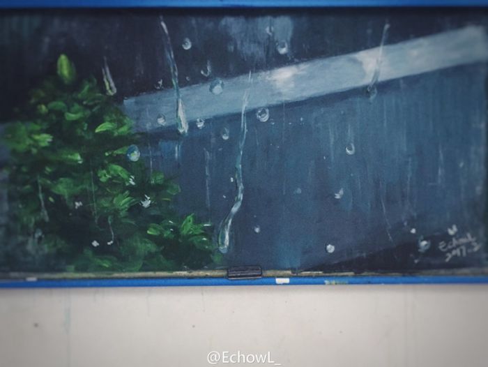 ここ數(shù)日は連日、春の雨が続いた。金曜日の午後から、楊さんは、新しい黒板アートの制作に著手し始めた。テーマは「春の雨」だ?!附襁Lは、春の雷がうるさくて、なかなか寢付けなかった。そのため、今回は雨上がりの様子を描こうと思い、日本の映畫『言の葉の庭』のワンシーンを描いた」と彼女は微博に投稿した。