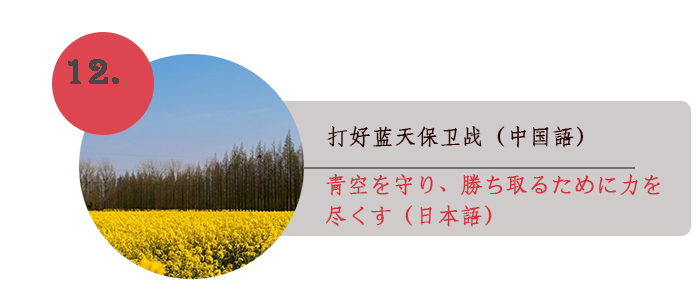 (日)青空を守り、勝ち取るために力を盡くす。二酸化硫黃と窒素酸化物の排出量をそれぞれ3%減らし、重點(diǎn)地域のPM2.5の濃度を大幅に低下させる。