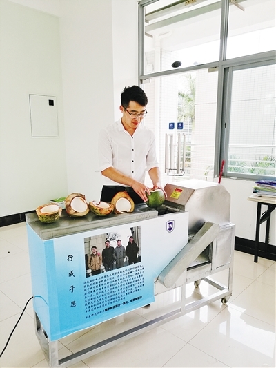 李さんは先輩の曾南春さんが発明した「ヤシの実処理の神器」からインスピレーションを得て、同裝置を開発したという。李克強総理は昨年3月、海南省でボアオ?アジアフォーラム年次総會に出席した際に、三亜市民観光客センターでこの「ヤシの実処理の神器」を使い果汁を取り出し、大學生の革新的な発想を評価した。
