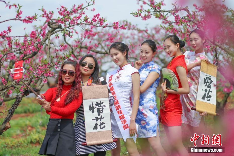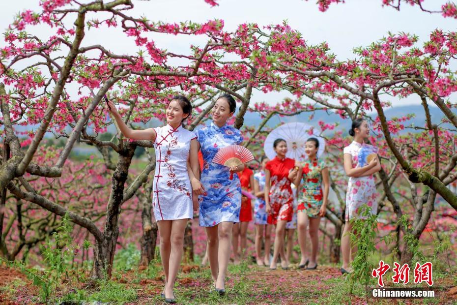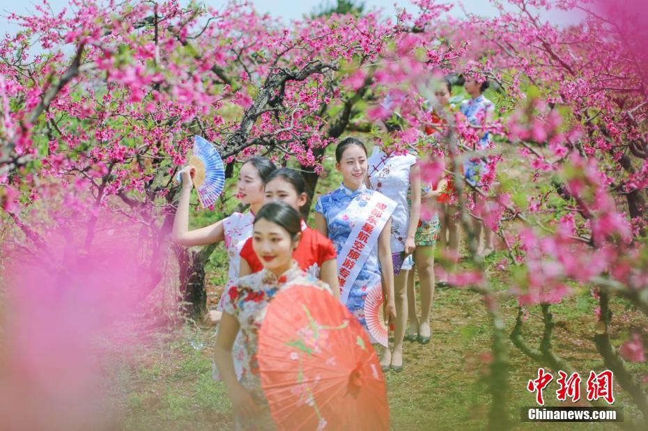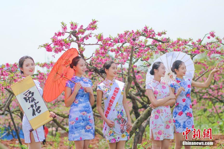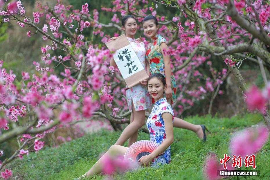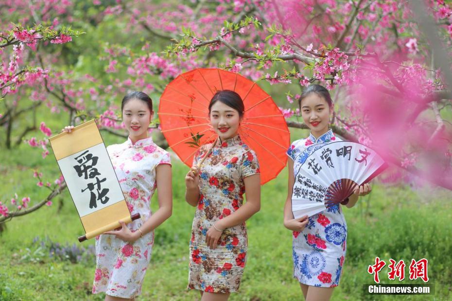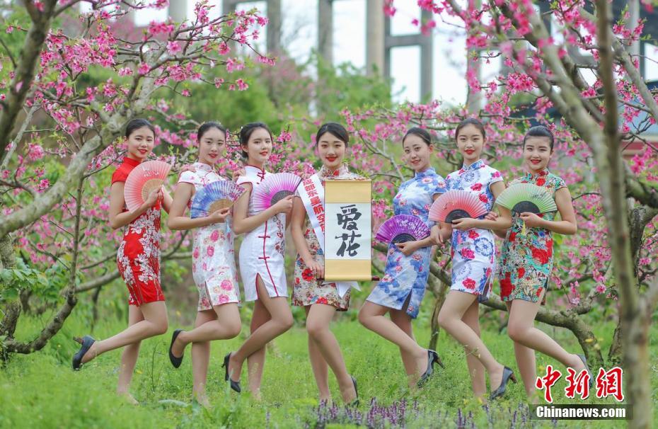 四川省成都市の成都東星航空學(xué)院の客室乗務(wù)員を目指す學(xué)生たちが3月31日、中國の伝統(tǒng)的なチャイナドレスに身を包み、同市の龍泉桃花村で、大自然を愛し、生態(tài)環(huán)境保護(hù)を意識するよう呼びかけた。中國新聞網(wǎng)が伝えた。(編集TK)