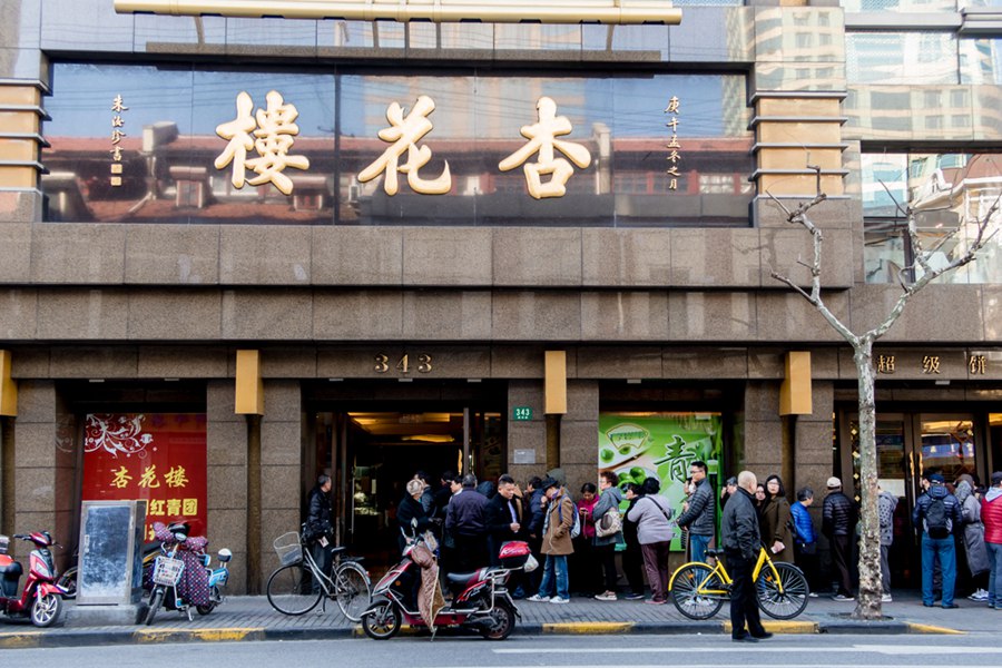 人気の高い上海の老舗菓子店「杏花樓」の本店の前には、青草餅「青団」を買いに來た市民が歩道まで列を作り、その列は向かい側のビルにまで伸びたことがある。販売されていたのは塩漬け卵とバター、挽き肉を合わせた具が入っている咸蛋黃肉松青団で、1箱6個入りで値段は50元(約800円)だった。
