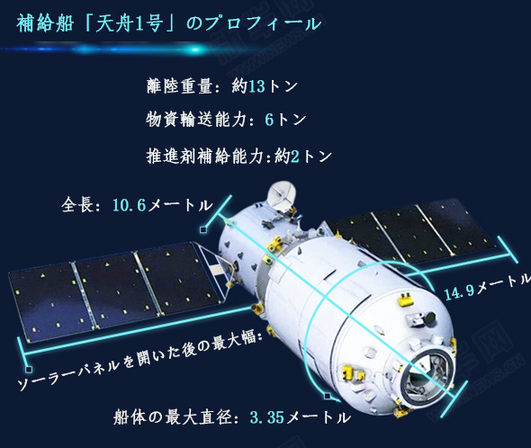 天舟1號は中國が自主開発した初の宇宙補(bǔ)給船で、貨物モジュールと推進(jìn)モジュールからなる。天舟1號は重さ6トンの貨物を、中國の未來の宇宙ステーションに送り屆けることができる。そのペイロードが占める比率は、現(xiàn)在のすべての補(bǔ)給船のうち最高となっている。航天科技集団第五研究院天舟1號チーフデザイナーの白明生氏は、「天舟1號が任務(wù)を完了すれば、中國は軌道上を運(yùn)行中の宇宙船に物資と推進(jìn)剤を補(bǔ)給する能力を備えたことになる。これは未來の中國宇宙ステーションの軌道上における長期有人飛行の前提となる」と話した。