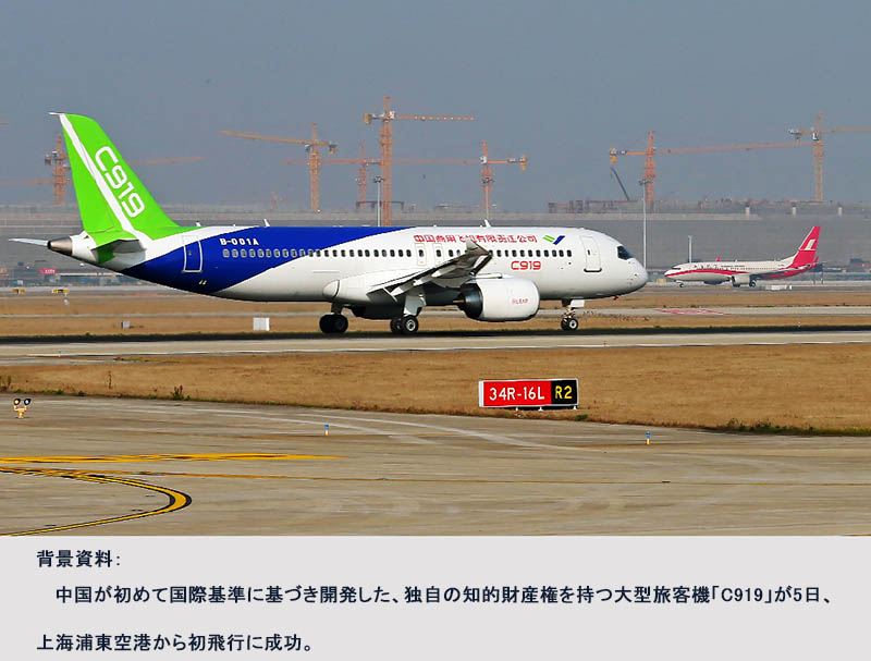 (日)中國が初めて國際基準(zhǔn)に基づき開発した、獨自の知的財産権を持つ大型旅客機「C919」が5日、上海浦東空港から初飛行する運びとなった。