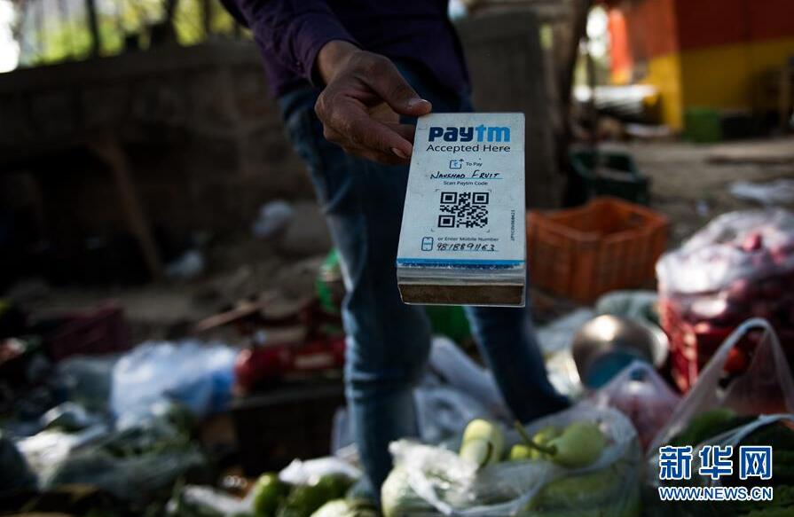 インド?ニューデリーの野菜を売る屋臺で、店主がPaytmのQRコードを出して電子決済を受け付けているところ。インドのPaytmは支付寶の親會社アント?ファイナンシャルの支援を受けて、インド最大のモバイル決済プラットフォームに成長した。(撮影:畢暁洋)