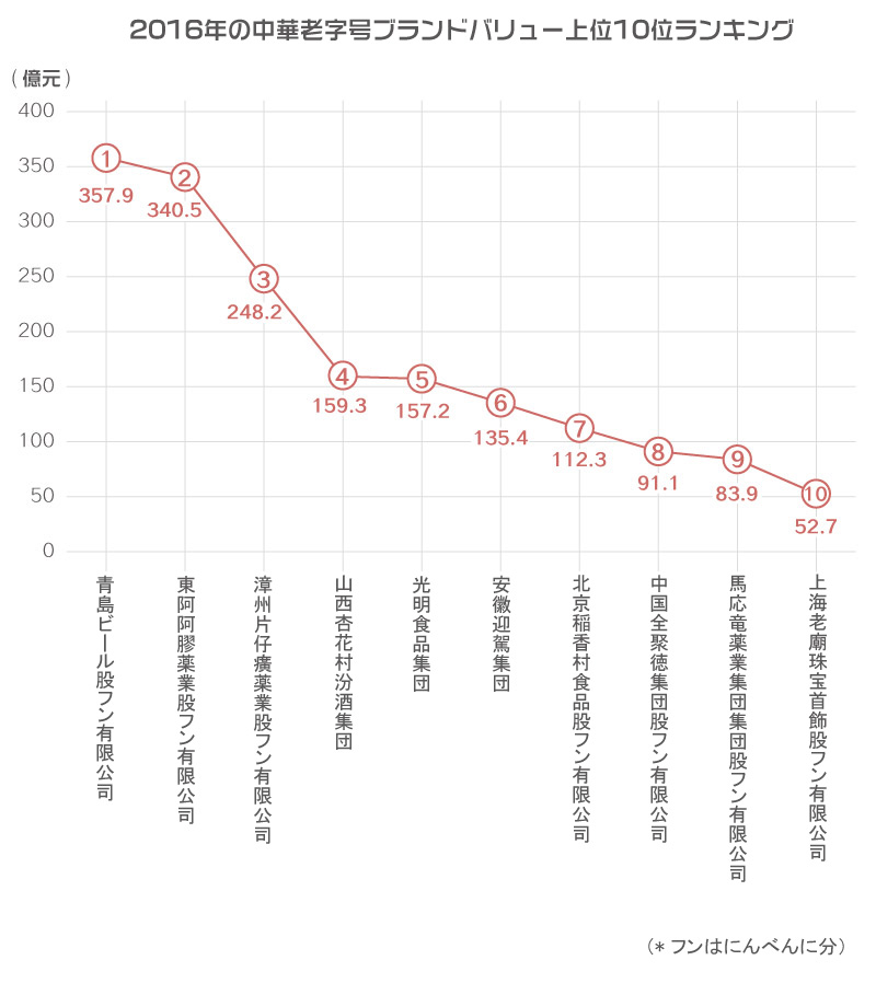 これらの老舗ブランドは政策による保護と時代とともに進む革新により、今もなお強い生命力と競爭力を備え、業(yè)界のリーダーになっているものもある。2016年の中國老舗ブランドバリューランキングでは、青島ビールが357億9千萬元(約5896億2千萬円)で1位の栄冠に輝いた。