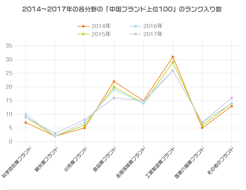 2014年から2017年にかけての中國ブランド上位100ランキングをみると、中國の需給構(gòu)造がバージョンアップしていることがわかる。供給側(cè)をみると、食品産業(yè)、工業(yè)製造業(yè)が供給構(gòu)造に占める割合が目立って低下し、科學技術(shù)産業(yè)、観光産業(yè)、小売産業(yè)、醫(yī)療介護産業(yè)の割合が著しく上昇している。需要側(cè)をみると、食品消費の割合が低下する一方で醫(yī)療介護消費の割合が上昇している。