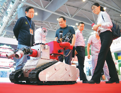 會場で展示されたロボット消防車(撮影?楊潔)。