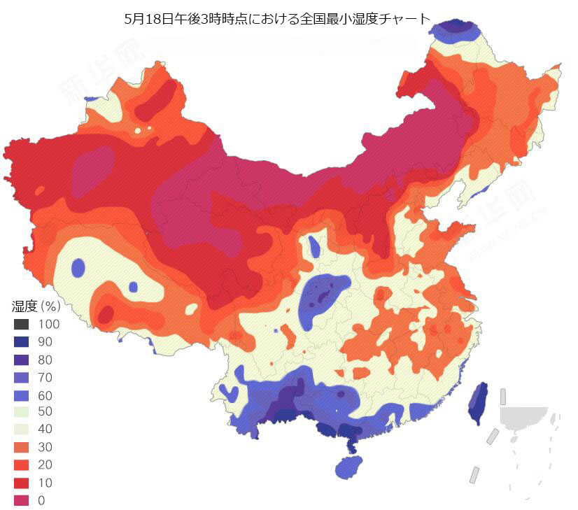 同じ溫度の場合、濕度が高いほど、ヒートインデックスが高くなる。今回の北方の高溫の天気についてみると、濕度がヒートインデックスを引き上げているというわけではない。それまで、北方では降雨が非常に少なく、ほとんどの地域では、1日の最小濕度が30%未満。內(nèi)蒙古(モンゴル)自治區(qū)では、最小濕度が10%未満の地域もあり、純粋な乾燥?日照りが続いたと言える。今回の高溫現(xiàn)象により、內(nèi)モンゴル?華北?東北地方の森林?草原で火災(zāi)が発生するリスクがより増大し、防火情勢は深刻な局面を迎えている。