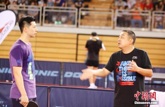 中國卓球チームは5月22日、ルクセンブルクで卓球世界選手権に備えて練習(xí)試合を行った。寫真は、男子チームの主力である馬龍選手に指導(dǎo)を行う劉國梁監(jiān)督(寫真右)。