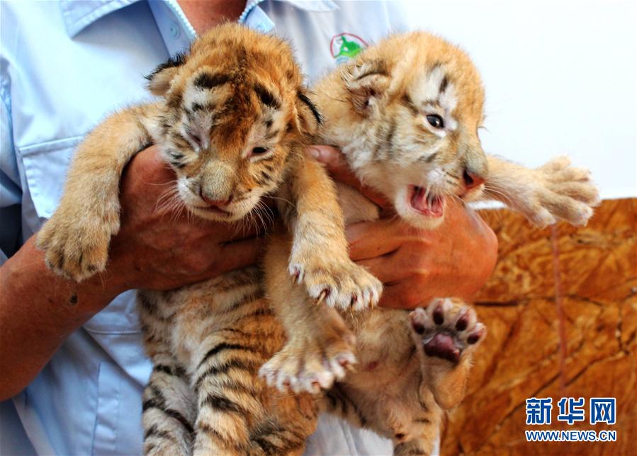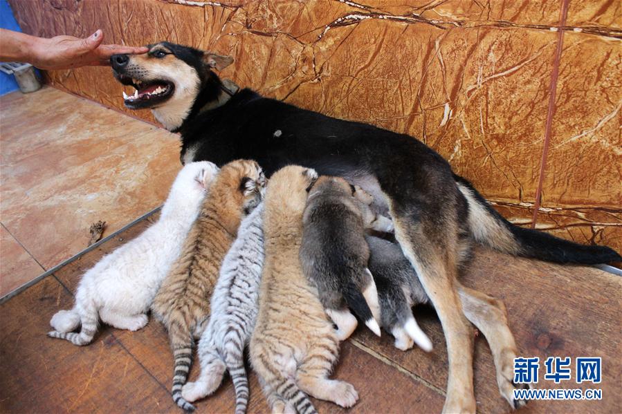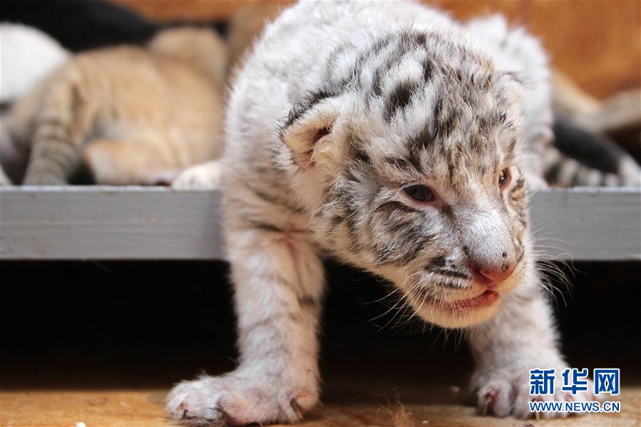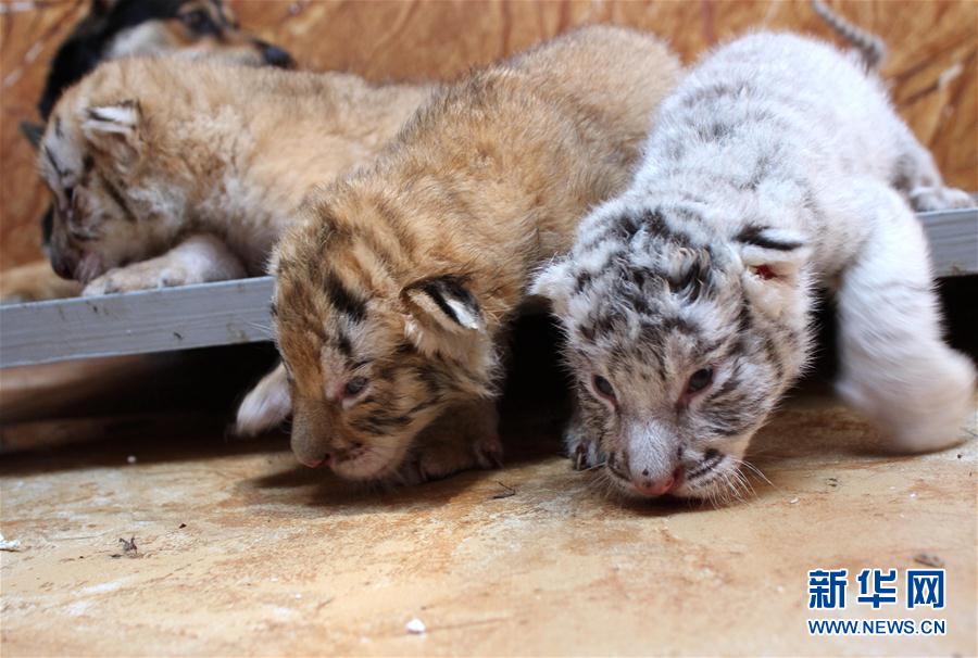 山東省栄成市西霞口野生動(dòng)物自然保護(hù)區(qū)ではこのほど4頭のトラの赤ちゃんが誕生した。そのうち2頭は黃色に黒の縞模様の「金虎」、1頭が白に黒の縞模様の「白虎」、そして最後の1頭は全身真っ白な「雪虎」という珍しい毛色?,F(xiàn)在赤ちゃんトラたちの健康狀態(tài)は良好で、出産したばかりのメスのイヌがこのトラたちの「乳母」となり、授乳している。新華網(wǎng)が伝えた。(編集TK)