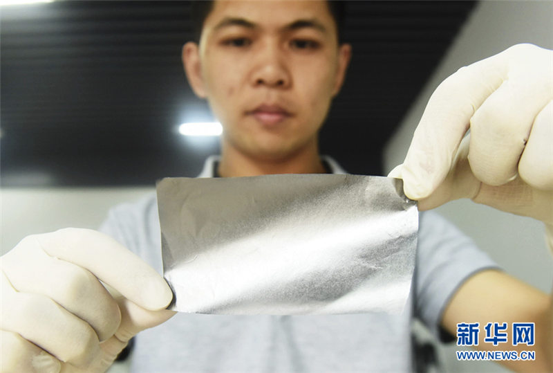 研究開発したグラフェンシートを披露する彭蠡さん(6月14日撮影)。