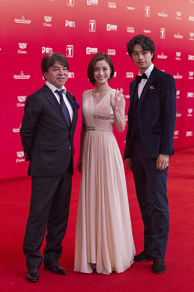 第20回上海國際映畫祭のレッドカーペットイベントに登場した映畫「晝顔」の西谷弘監(jiān)督、上戸彩、斎藤工。