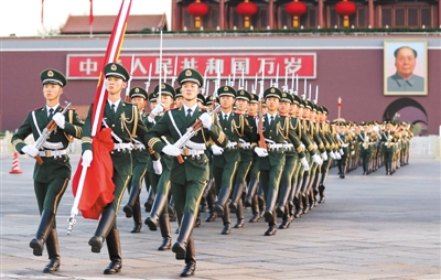 毎日太陽が地平線から昇り、中華の大地を照らす頃、首都北京の天安門広場ではオリーブ色の制服の部隊が、五星紅旗を護衛(wèi)しながら、力強く高らかな歩調で闊歩前進する。