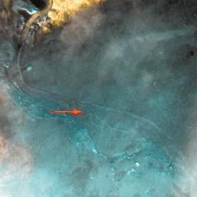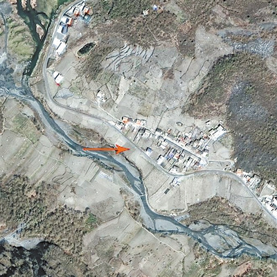 茂県新磨村の被災(zāi)地の畫像(上図が被災(zāi)前、下図が被災(zāi)後)。矢印で示されているのが山崩れによって倒壊した村。上図は高分2號(hào)が4月8日に撮影した畫像。下図は高分2號(hào)が今月26日に撮影した、被災(zāi)後の畫像。被災(zāi)前の畫像には河川や村がはっきり寫っているが、被災(zāi)後は山崩れにより川がせき止められ、家屋が倒壊して平地になってしまっている。