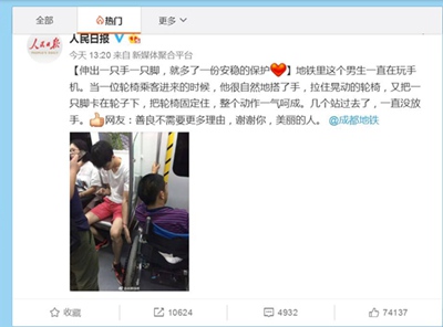 四川省成都市の地下鉄4號(hào)線の車(chē)內(nèi)で、26日に撮影された寫(xiě)真が「感動(dòng)的」だとネット上で拡散され、話題となっている。寫(xiě)真に寫(xiě)っている男性は地下鉄の座席に座り、右手でスマートフォンゲームを遊びながら、隣の車(chē)いすのタイヤを左手と左足でしっかりと抑えていた。人民日?qǐng)?bào)の微博(ウェイボー)公式アカウントが投稿したこの寫(xiě)真が話題となり、投稿後約7時(shí)間で7萬(wàn)回以上の「いいね」がクリックされた。四川新聞網(wǎng)が伝えた。