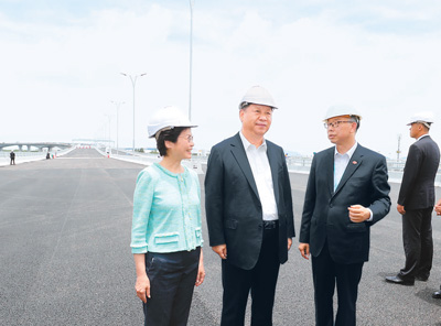 習主席はまず、港珠澳大橋の香港區(qū)間の建設(shè)工事現(xiàn)場を訪問し、建設(shè)狀況を聞いたほか、工事の計畫や工事の進捗狀況、質(zhì)、安全性などについて詳しく質(zhì)問した。そして、「港珠澳大橋の建設(shè)は、中央政府が香港、マカオ、珠江デルタ地域のさらなる発展をサポートするための重大なプロジェクトで、『一國二制度』下で、広東省、香港、マカオが密接に協(xié)力した重大な成果。今後の業(yè)務を積極的に推進し、大橋が開通し、安全に運行できるようにすることを願っている」と話した。