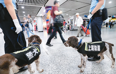 上海地下鉄徐家匯駅で勤務(wù)に當(dāng)たる、捜査犬を攜えた人民警察 (6月15日、撮影?凡軍)