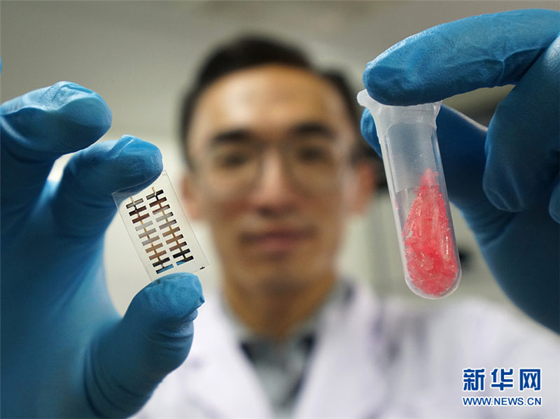 22日、新型分子圧電材料水晶體(右)と、新型分子圧電材料の薄膜部品(左)を紹介する同センターの遊雨蒙研究員