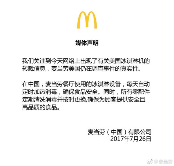 今回の事件に際して、マクドナルドの中國部門は26日午後11時(shí)頃、微博(ウェイボー)公式アカウントで、「米國アイスクリーム製造機(jī)に関するメディア聲明」を発表した。同聲明は、「當(dāng)社は今回ネット上で話題となっている米國のアイスクリーム製造機(jī)に関する情報(bào)について注目しており、米マクドナルドは事件の真?zhèn)韦摔膜い片F(xiàn)在調(diào)査を行っている。中國のマクドナルドで使用しているアイスクリーム製造機(jī)は毎日定期的に自動(dòng)加熱殺菌を行っており、食品の安全を保証している。そのほか、使用している機(jī)械の部品全てを定期的に洗浄?消毒と交換を行い、顧客に安全かつ高品質(zhì)な食品を提供することに努めている」としている。(編集YK)