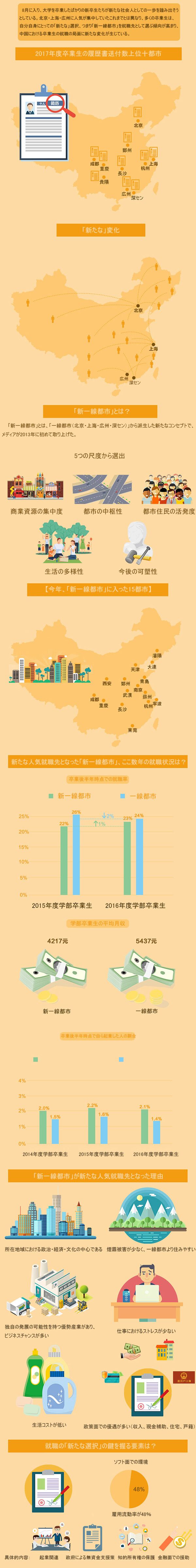 新卒生の就職における新傾向:卒業(yè)生は、飲食や教育など生活サービスに関わる業(yè)界での仕事により高い関心を示している。一方、企業(yè)側(cè)のニーズをみてみると、電子商取引業(yè)界の飛躍的な発展とそれに伴う物流業(yè)界の人材ニーズの急増など、ここ數(shù)年人気を集めている業(yè)界において、深刻な人材不足が見られた。また今年の新卒生は、もはや一線都市に集中することはなく、成都や重慶、杭州などの「新一線都市」が、2017年度卒業(yè)生にとって新たな人気就職先となった。