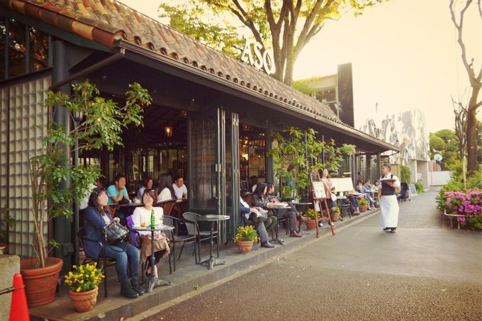 書店を出ると、店と店の間には清潔感あるテーブルとイスが並べられており、そこでいつでも足を休めることができる。たくさんの木が立ち並び、夏でも涼しく感じさせ、冬に店に入るとストーブがあり、溫まることができる。