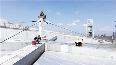 「鳥の巣」の屋上部分を水性塗料で塗裝する作業(yè)員(8月17日撮影)
