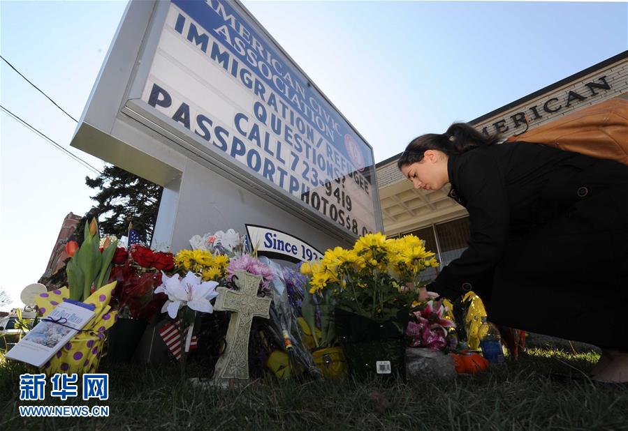 2009年4月3日、米ニューヨーク州ビンガムトンで銃亂射事件が発生し、犯人を含む14人が死亡し、4人が負傷した。寫真はアメリカ市民協(xié)會前で獻花し、犠牲者を悼む女性(撮影?申宏)(編集NA)
