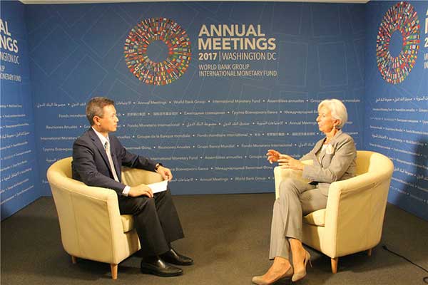 ワシントンで人民日報のインタビューをうける國際通貨基金(IMF)のクリスティーヌ?ラガルド専務(wù)理事(寫真右、10月12日撮影?呉楽◆、◆は王へんに君)。
