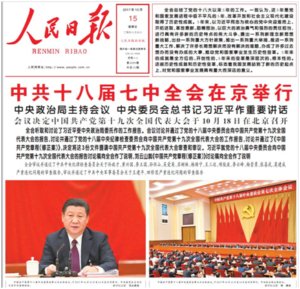 中共中央機関紙「人民日報」(10月15日付)の七中全會報道より。孫政才ら12人の黨籍剝奪処分を確認した。