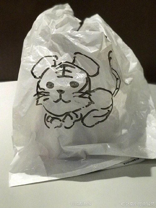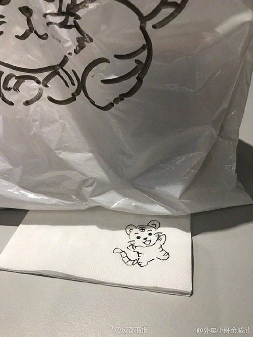 あるデリバリー配達(dá)員は16日、配達(dá)の注文を受けた際、顧客が備考欄に「最近失戀してしまった。トラの絵を描いてくれない?」と書(shū)かれてあったので、料理を入れたビニール袋と紙ナプキンにトラの絵を描いてあげたという話をネット上に投稿し、話題となっている。成都商報(bào)が伝えた。