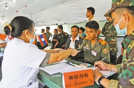 2017年7月にラオス北部の小都市で、中國(guó)から派遣された醫(yī)師団がテントの中で現(xiàn)地の住民たちの診察をする様子(撮影?張志文)。