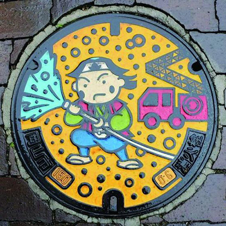 (中)在日本,井蓋已經(jīng)成為鮮明的城市名片,人們將它設(shè)計(jì)得五花八門(mén),有的采用市花、市樹(shù)作為圖案,有的用當(dāng)?shù)赝撂禺a(chǎn)或手工藝品,有的還會(huì)把名勝或歷史故事畫(huà)上去。