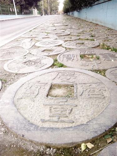 趣園路は、「趣園」と呼ばれる街心公園の南側(cè)に位置する、幅わずか數(shù)メートルの裏通りになる路地で、通行人も少ない。この道路のうち、全長150メートルあまりの區(qū)間には、「古銭」をかたどった石が敷き詰められており、それらはいずれも、厚みのある青石の上に「古銭」のデザインが彫られたものだ。これらのうち最も大きい貨幣は「萬暦通寶」で、直徑約1.5メートル、小さいものはわずか約1尺(26センチ前後)、成人の足のサイズほどだ。刃形や鼎形の古銭も少なくないが、最も多いのは丸型で四角い穴のあいたものだ。これらは隙間なくぎっしりと並べられており、1枚1枚すべてに字が書かれている。