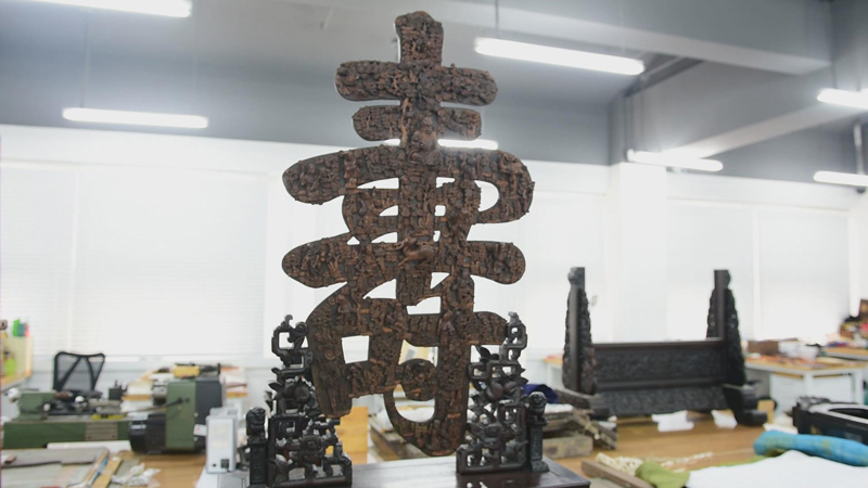 乾隆年間に作られた木でできた長壽を祝う飾り物。近くでみると、驚くほど複雑な彫刻技術(shù)が使われていることがわかる。