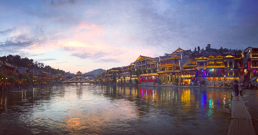 「張家界を晝過ぎに出て、夕方、鳳凰に到著。日が沈み、マジックアワーの時間帯に何とか間に合いました。まさに鳳凰のように輝く電飾や空のグラデーションがとても印象的でした。この日の夜は、ゲストハウスで中國人大學生と意気投合し、一緒に夜の鳳凰古城を散策したのですが、古城內(nèi)には「日本人入店禁止」のお店も何軒かあります。ただ、「それもまた中國」という寛大な心でいきましょう。」